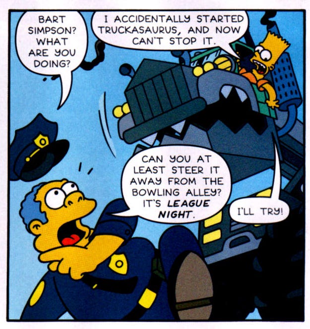Truckasaurus Classic clearly captured people's imaginations, as he appears in ancillary media far more than in the show. This is mostly in video games, but once in Bart Simpsons Comics #35, in a story aptly named "The Return of Truckasaurus":